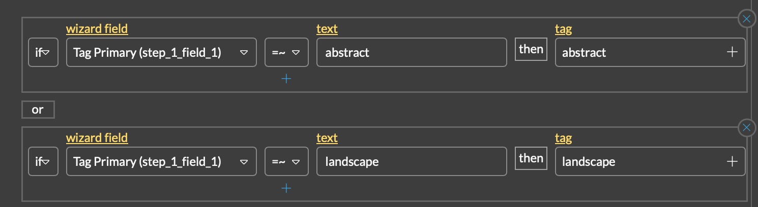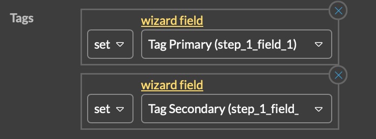 I’m trying to approach this another way by having two tag fields, one with a primary tag group and another with a secondary tag group. Of course, you can only use one tag field in the action section. So I’m trying to workaround this by having if statements for the tag; if w{step_1_field_1} is tag-name, then apply that tag, but I’m having an issue of it recognizing the tag from the tag field. For example this does not work: